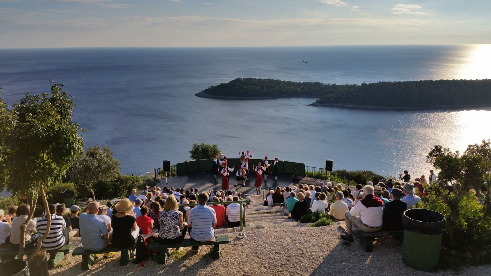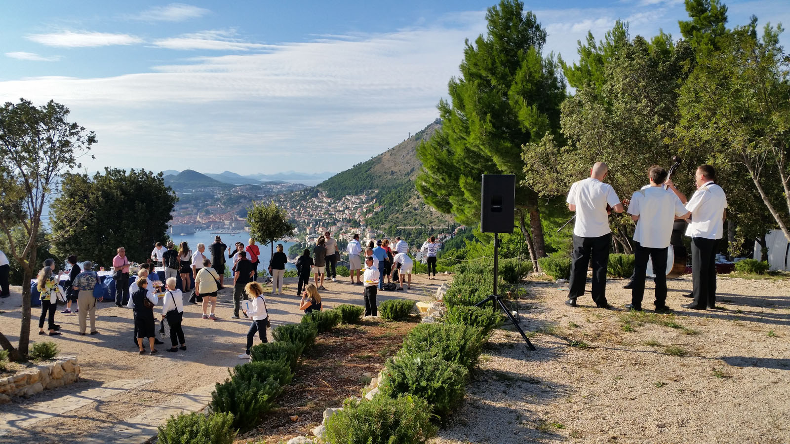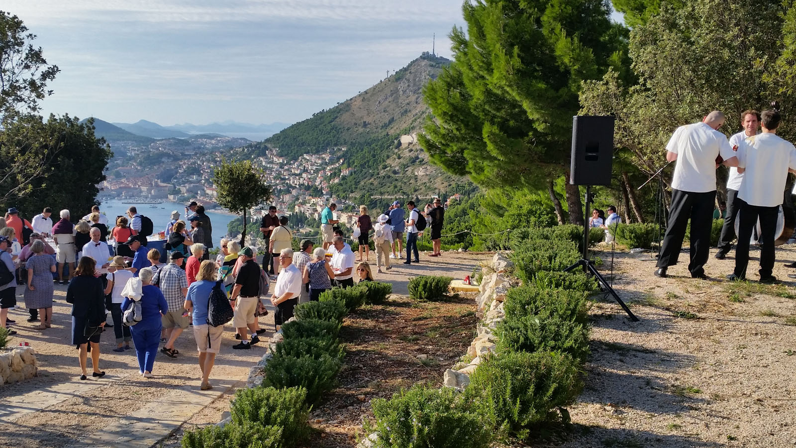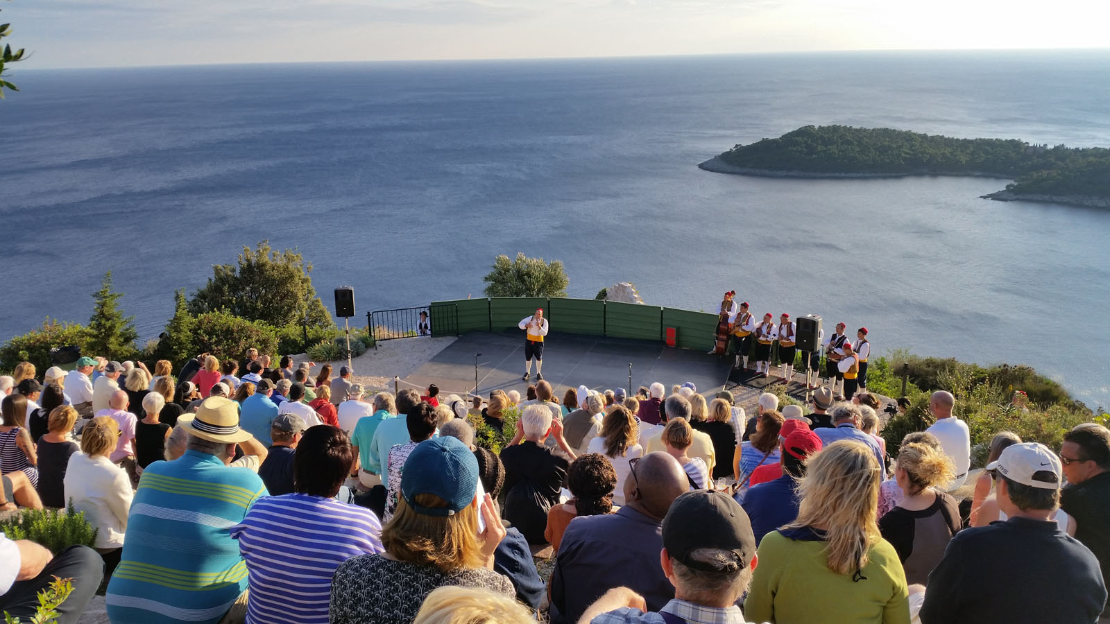 We mingled, enjoyed the amazing panoramas, and were entertained by a local group of singers called "klapa", who sang traditional a capella songs, After the cocktail hour, we set in an open amphitheater and enjoyed an exclusive folklore performance by the Lindo ensemble. The Linđo program included a total of 5 dances from all over the Croatia including: Valpovo, Baranja, Bunjevac, Međimurje and Linđo dances. In addition to dances, Linđo boasted great singing skills with the performances of songs for the audience during the breaks between the dances. They performed a total of 4 songs showing the rich musical and cultural heritage of the region.