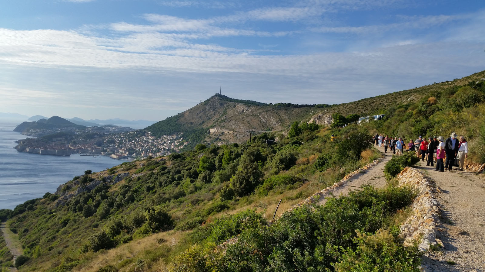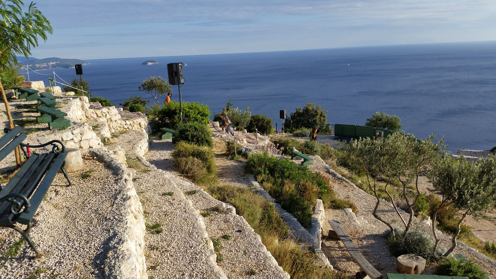 “Around 4 PM, we gathered on the pier in Dubrovnik Old Town port and strolled through the Old Town to the nearby Ploce Gate. They had busses waiting for us here, to take us to the location of the event, the Park Orsula. The park has a unique location in Dubrovnik, overlooking the Old Town with some amazing views of the Adriatic Sea. Upon arrival, our hosts greeted us with a welcome drink, a traditional Croatian sweet wine called Prosek and fresh orange juice. There was an abundance of local delicacies to taste, such as: seafood, smoked ham, cheese, sausages, fish patte, fresh fruits, local cookies and deserts, appetizers…